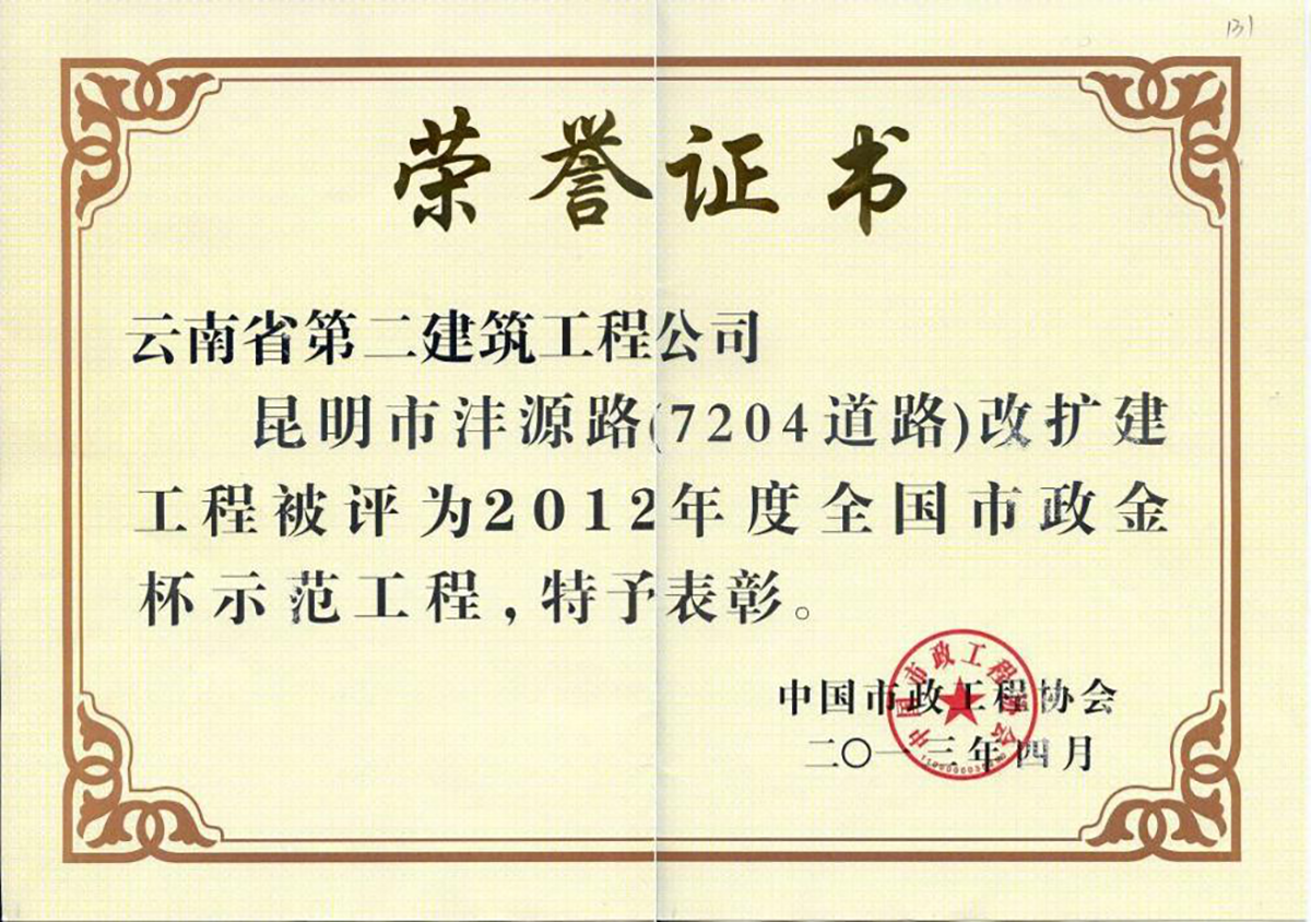 20 | 全国市政金杯示范奖 | 昆明市沣源路(7204道路)改扩建工程 | 中国市政工程协会 | 2021年 |